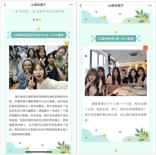 以心为语,朋辈互助。学院依托一站式学生社区和公众号“心闻会客厅”栏目,开展“‘寝’系你我,‘寓’见美好”照片征集活动,引导同学们寻找暖心伙伴,发展友谊。活动期间,学生们踊跃上传自己与可爱室友的创意合照,并附上感人话语和温暖故事。有的在宿舍“温馨小窝”里开心地分享着美食;有的在夜晚的灯光下,围坐一起分享着彼此的故事……