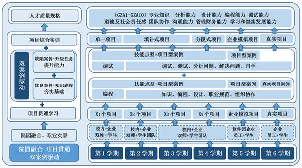 以提升学生职业技能为目标,强化实践教学,建立了“项目贯通、双案例驱动”的人才培养体系。通过五类项目的技能训练,全面培养和训练学生的软件设计、开发、测试和维护技能。