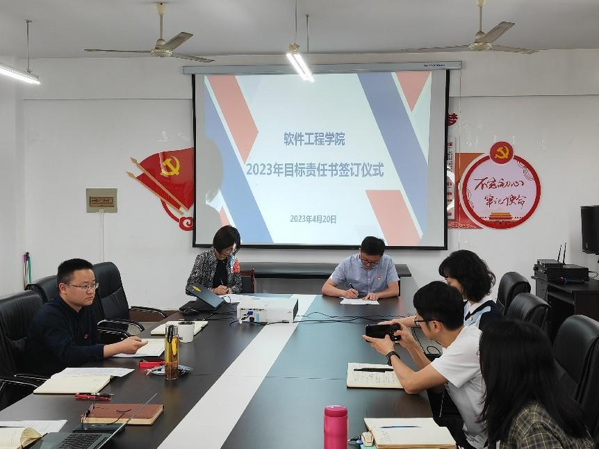 本网讯(通讯员 金垒文/图)为压紧压实责任,确保学院各项工作高质高效推进,4月20日下午,软件工程学院召开全院教职工大会暨2023年度目标责任书签订仪式,学院全体成员参加,会议由院长王敏主持。