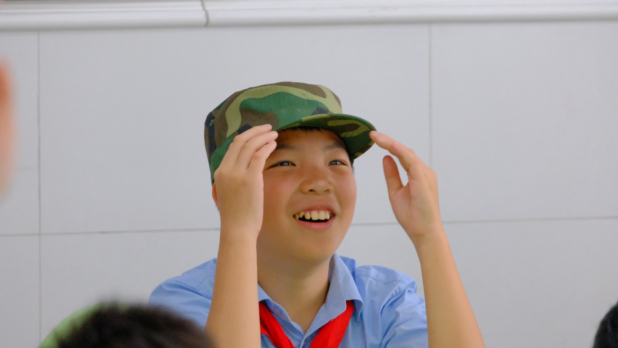 张逸杰的讲述吸引了全场孩子的目光,小朋友们迫不及待的、争先恐后的举手与他互动。“你使用的枪械型号是什么样的?”“供给短缺时为什么不下海捕鱼?”“怎样才能加入中国人民解放军?”张逸杰一一解答了小朋友们的问题,并用生动有趣的方式给孩子们科普了海军知识,又以大哥哥的身份鼓励同学们强身健体、发奋学习,为祖国强军贡献自己的力量。本次主题教育班会持续约2个小时,掌声此起彼伏、经久不息。结束后,小孩子们围绕着张逸杰合影拍照,张逸杰也给孩子们戴上了迷彩军帽。