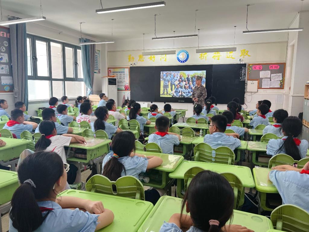 张逸杰用中印冲突的一段视频开启了本场班会,他为孩子们讲述了自己怀揣报国梦想、立志从军,两年多的时间先后在福建、上海和南沙群岛戍边卫国的经历,从服役环境、日常训练、岛礁实训到前线作战。他教育引导孩子们:“我们不是生活在一个和平的时代,而是生活在一个和平的国家,一定要珍惜现在的美好生活,努力学习,建设祖国。”