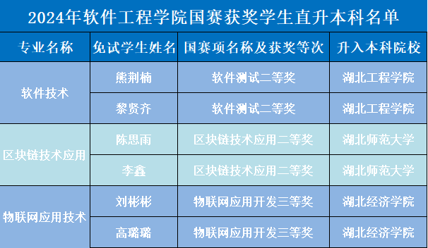 本网讯(通讯员 胥海燕 文/图)近日,湖北省教育厅发布《省教育厅关于做好2024年湖北省普通高等学校专升本工作的通知》。根据最新政策要求,经申报审核后,我校2021级共14名优秀学子凭借出色的技能大赛成绩脱颖而出,其中,软件工程学院共6名学生荣获专升本免试资格,直接升入本科院校深造。