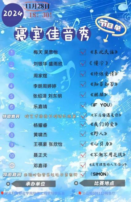 本网讯(通讯员 汪翩 文/图)11月28日晚,软件工程学院举办了一场别开生面的“寝室佳音秀”比赛。比赛以“室雅何须大,音悦自有情”为主题,旨在通过音乐的力量,增强寝室成员之间的情感联结,丰富学生的课余文化生活。