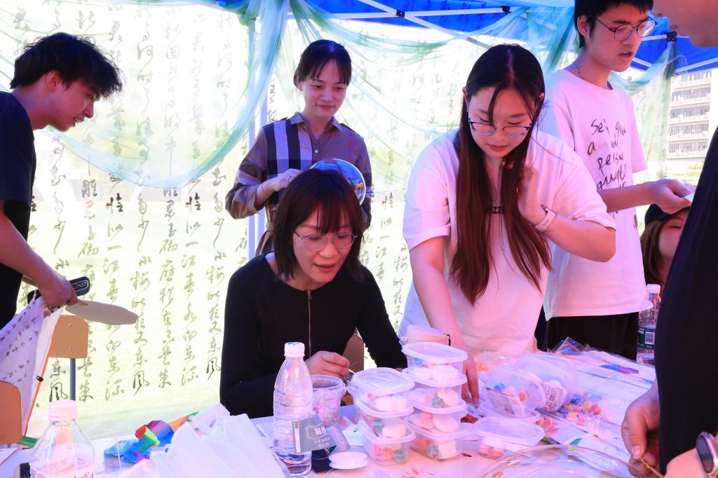手绘风筝环节,同学们纷纷发挥奇思妙想,都希望绘出一个独特的风筝。有的同学为了保证绘画质量,耐心地用铅笔打稿;有的同学为了保证绘画的层次性,将颜料进行各种“排列组合”;还有的同学在风筝上题字,给风筝增加诗意……在这短短的几个小时里,伴着乐声,同学们都卸下了压力,将心思聚焦于手中的风筝和缤纷的色彩中,在一涂一抹,一点一染中,大家不仅绘成了风筝,也绘出了好心情。经过同学们富有特色的绘制,原本单调的风筝都穿上了美丽的“花衣”。现场,书法爱好者也以细腻而流畅的笔触书写对传统文化的热爱与传承,从隶书到楷书,一笔一画流露出风采与气质。