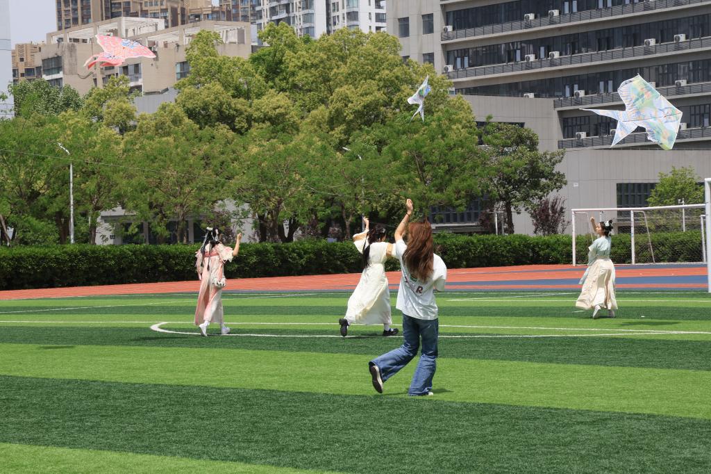 “轻风托纸鸢,扶摇上青天”。一根风筝线,就可以将身心交付于蓝天。师生们个个精神十足,全心投入,三五成群地在操场上奔跑着、欢呼着、呐喊着。收线、放线,是与天空的探戈舞步;欢笑、奔跑,是大好春日的尽情迸发。细线牵扯着的,不只是风筝,更像是扶摇而上的勇气!“好风凭借力,送我上青云”,在大家齐心协力的合作下,色彩斑斓、形状各异的风筝成功与蓝天拥抱,在空中翩翩起舞。更有同学们着汉服襦裙看鸢飞蝶舞,青春与传统碰撞,春景与国学共振,双倍快乐,给春天里的自己加一层“文化滤镜”。
