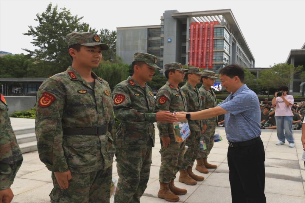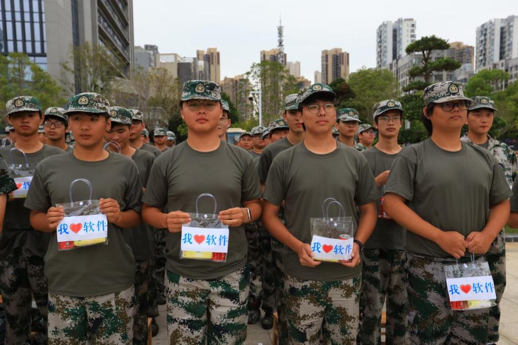 随后,学院领导班子成员们纷纷走入连队方阵,将一份份印刻着“我❤软件”的慰问品送到教官和同学们手中,并与同学们亲切交流,询问训练强度、身体状况和适应情况,叮嘱大家科学训练、注意休息、及时补水,以最佳状态迎接挑战。