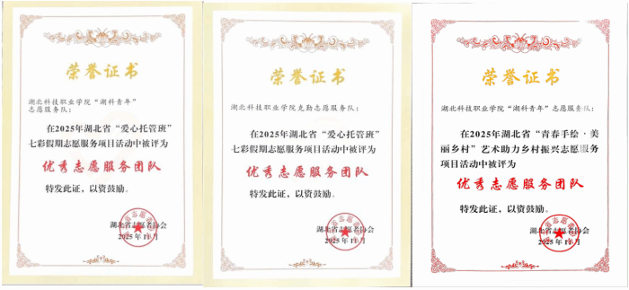 本网讯(通讯员 雷楹/文 黄雨婷/图)近日,2025年湖北省志愿服务项目优秀团队入选结果陆续公布,我校志愿服务团队喜获三项省级荣誉。其中,“湖科青年”志愿服务队与“克勤”志愿服务队双双获评湖北省“七彩假期”志愿服务优秀团队称号;同时,“湖科青年”志愿服务队凭借在利川市五二村乡村美育实践中的突出表现,荣获“青春手绘·美丽乡村”志愿服务优秀团队称号。