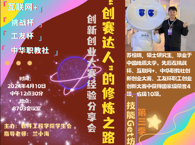 第二期活动《“创赛达人”的修炼之路——创新创业大赛经验分享会》于4月9日举行,活动特邀优秀创新创业指导老师苏恒瑞进行分享。苏恒瑞讲述了自己参加各类创新创业大赛的历程和宝贵经验,他带队参赛的故事引起了在场同学们的强烈共鸣。苏恒瑞老师还就“互联网+”“挑战杯”等创新创业大赛的团队组建、项目选题、路演技巧等方面与同学们进行了深入交流。他耐心解答同学们的问题,传授了许多宝贵的经验和技巧,为同学们提供了切实可行的指导和建议。