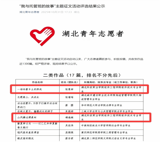本网讯(通讯员 金垒 文/图) 近日,在湖北省少工委、湖北省志愿者协会联合主办的“我与托管班的故事”主题征集活动中,我校克勤志愿服务队喜获佳绩。由软件工程学院软件技术专业张葛妍、谢逸璇两位同学创作的作品《一场向着乡土的奔赴》与《山风拂过课桌时》,在全省高校1300多篇征文中脱颖而出,双双荣获二等奖。