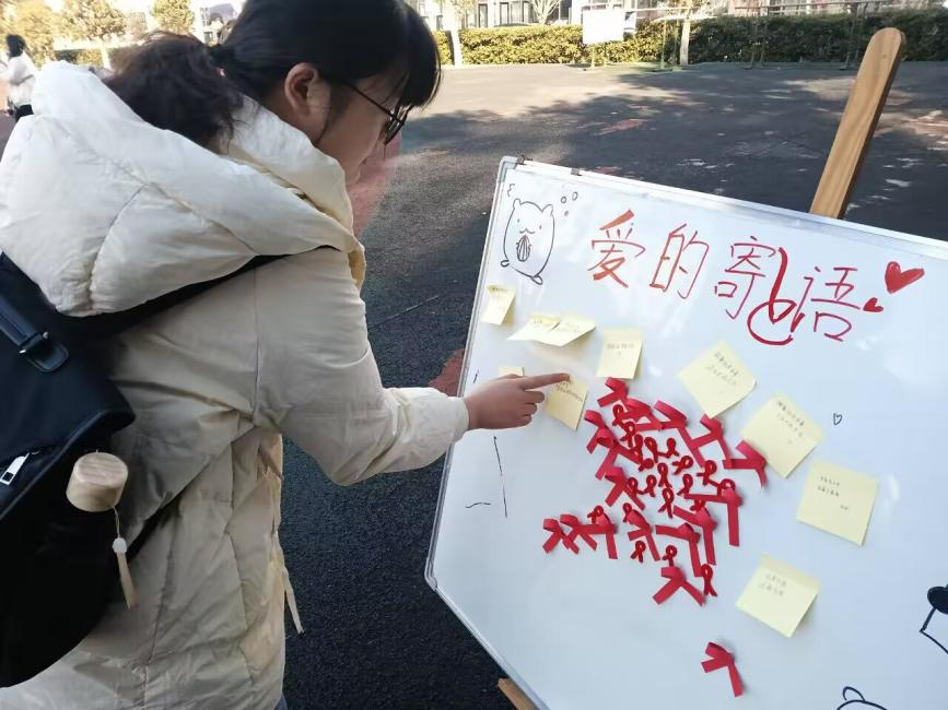 “相互关爱,共同防艾”“消除歧视,健康成长”“防艾手牵手,关爱心贴心”……前来参与活动的同学们纷纷在“艾”留言板上写下关于防艾抗艾、健康成长的温暖留言,并留下“爱”的痕迹。将温暖和鼓励传递,让善意在校园中流转。